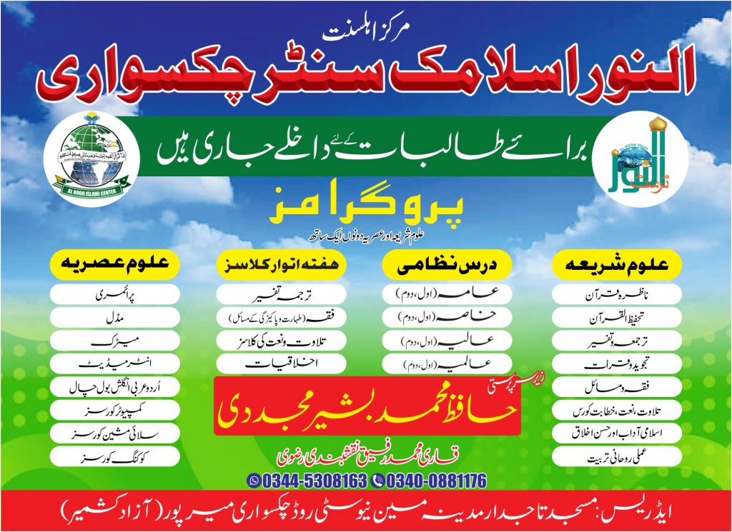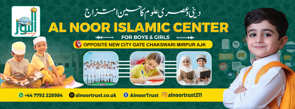 AL NOOR ISLAMIC CENTER Located in Azad Kashmir Pakistan, this madrissa provides both religious and contemporary education. It aims to empower students with spiritual understanding and practical knowledge to serve humanity with sincerity.