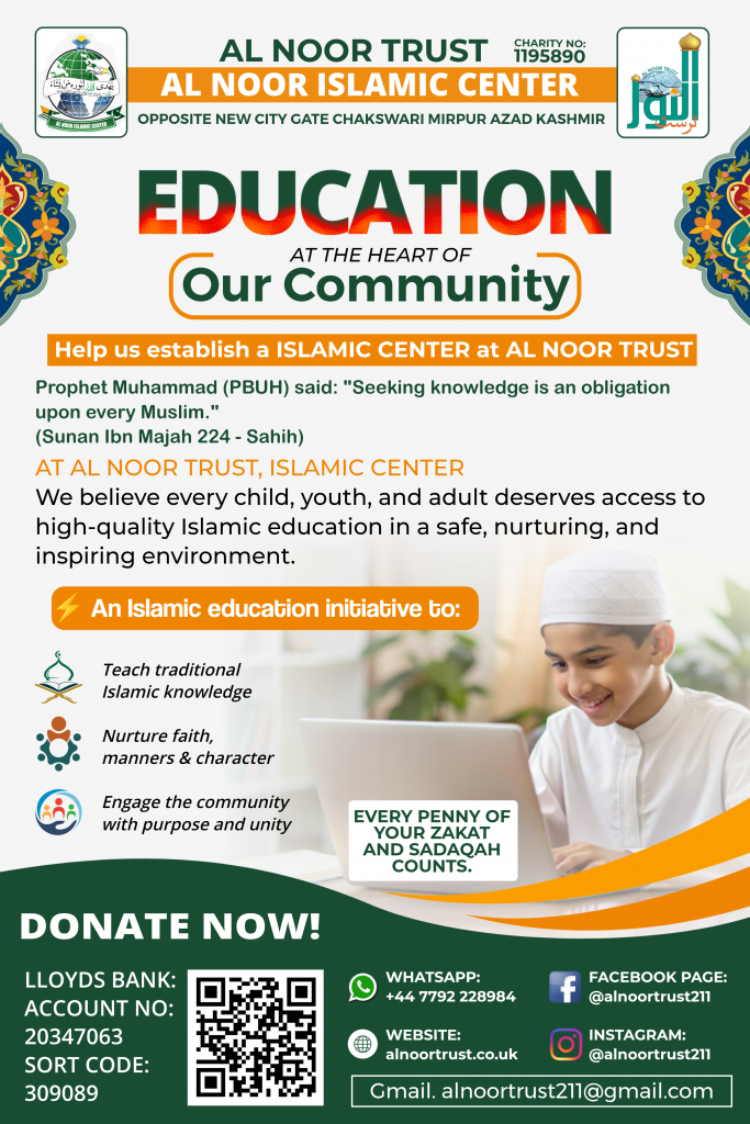 AL-NOOR TRUST is committed to serving humanity and providing essential aid to those in need. Every contribution, no matter the size, helps us transform lives—whether through providing education, healthcare, or crucial food supplies. We guarantee transparency and ensure your donation reaches the right hands at the right time. Join us today in this journey of kindness and compassion.